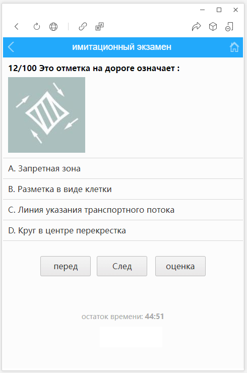 3. имитационный экзамен:В соответствии с правилами экзамена случайный отбор 100 вопросов экзамена, время экзамена 45 минут, 1 балл за вопрос, 90 баллов и выше.